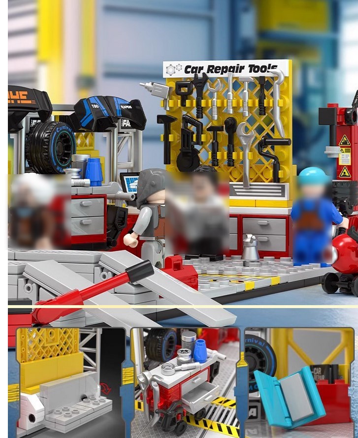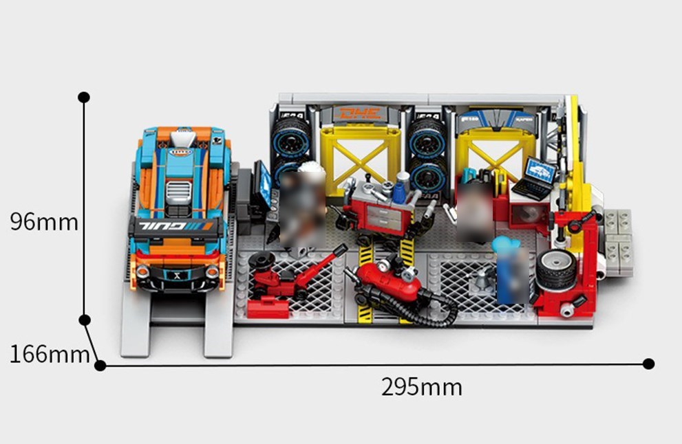 Realistische Tuning-Werkstatt mit hohem Spielfaktor. Das Set ist eigentlich für 6-Noppen breite Autos konzipiert, funktioniert aber auch für 8-Noppen breite Sportwagen wie z.B. der Speed Champion oder Model S Reihe.