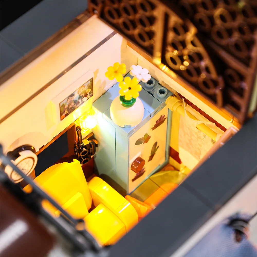 Der detailreiche Camper im Retro-Truck-Stil bringt nicht nur das Flair vergangener Zeiten zurück, sondern auch die passende Beleuchtung gleich mit: Warmgelbe Lichtpunkte erwecken Erinnerungen an laue Sommernächte, Abendessen im Freien und das leise Summen der Natur.