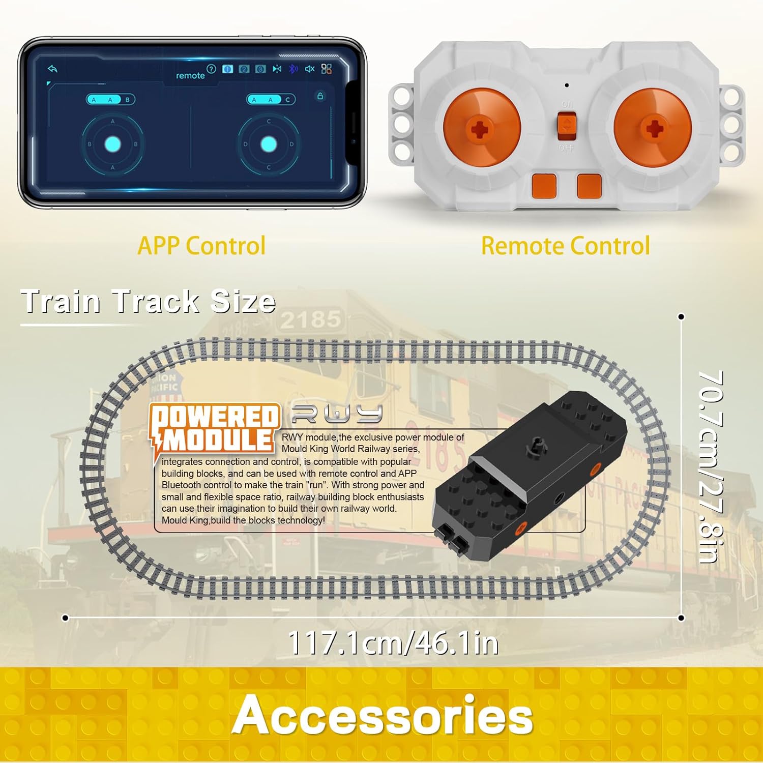Dieses Set ist mit dem Mould King RWY-Modul motorisiert und wird über die beiliegende Fernbedienung gesteuert. Das RYW-Modul vereint Antrieb, Empfänger und Akku in einem Modul, dass an den Form-Faktor des Eisenbahn-Motor angelehnt ist (aber 1 Noppen breiter).