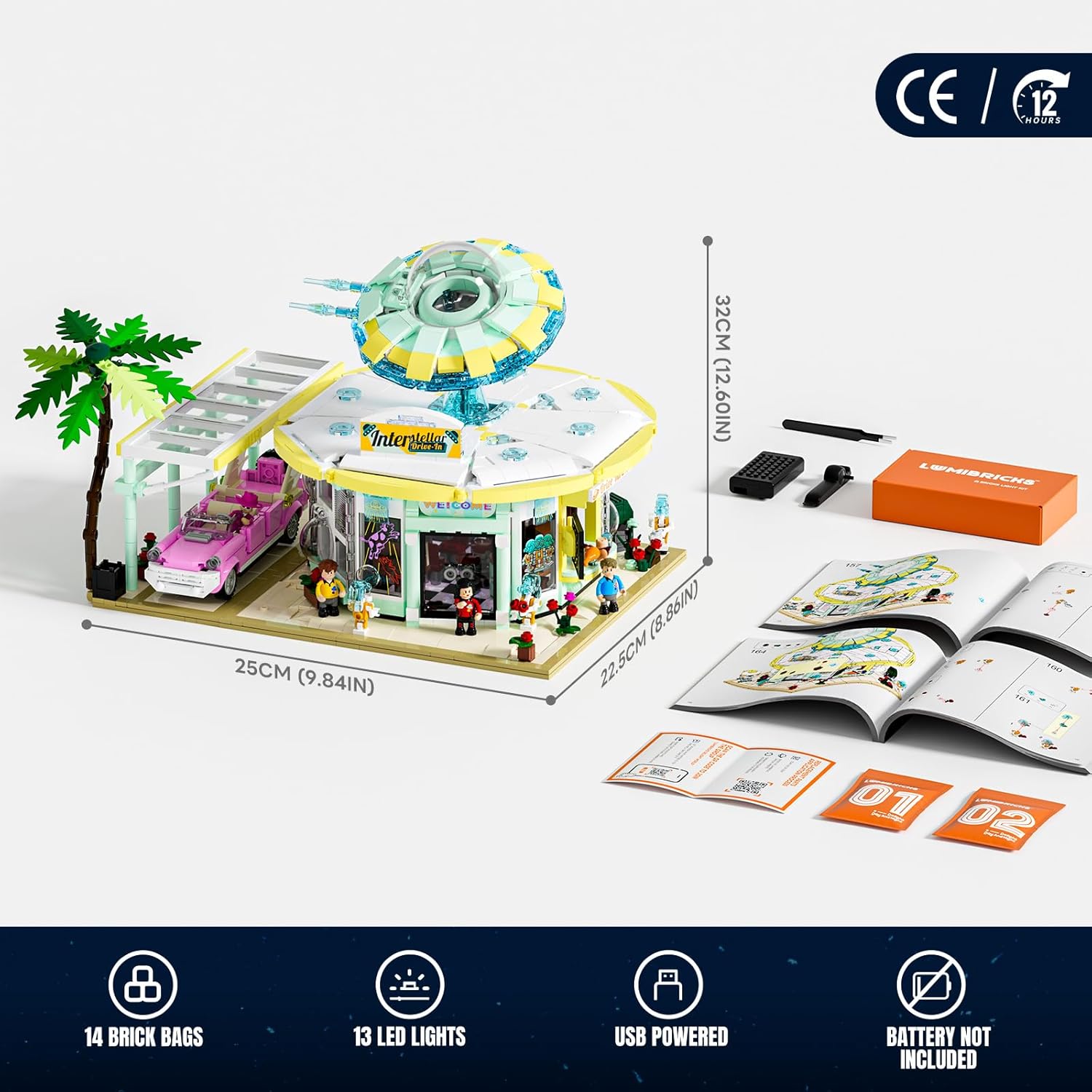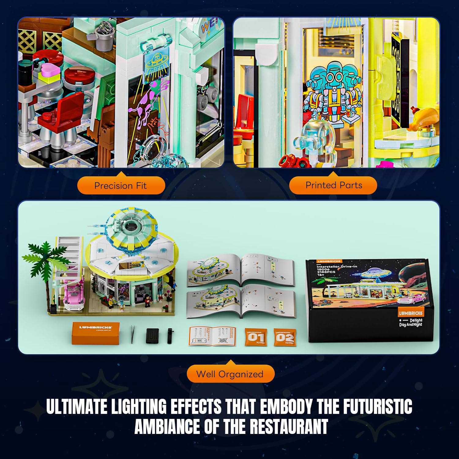 Das Modell besticht durch seine beeindruckende Architektur und seine filmreife Lichtinszenierung. Über dem Restaurant schwebt eine gewagte UFO-Kuppel, die wie ein überdimensionales Wahrzeichen der irdischen Neugier wirkt. Das Dach lässt sich modular abnehmen, um den detailverliebten Innenraum zu offenbaren: schwarz-weiße Fliesen, glänzende Sitze, futuristische Jukebox – jedes Detail atmet den Charme einer Retro-Vision der Zukunft. Das integrierte LED-System mit 13 Lichtpunkten und zwei Leuchtleisten ist dabei kein Gimmick, sondern das Herz des Designs: Es verleiht dem Modell seine charakteristische „Space Neon“-Aura und verwandelt es nachts in eine leuchtende Bühne. Der Bauprozess fordert Sorgfalt, belohnt aber mit einem eindrucksvollen, interaktiven Ergebnis, das Mechanik, Atmosphäre und Fantasie perfekt verbindet.