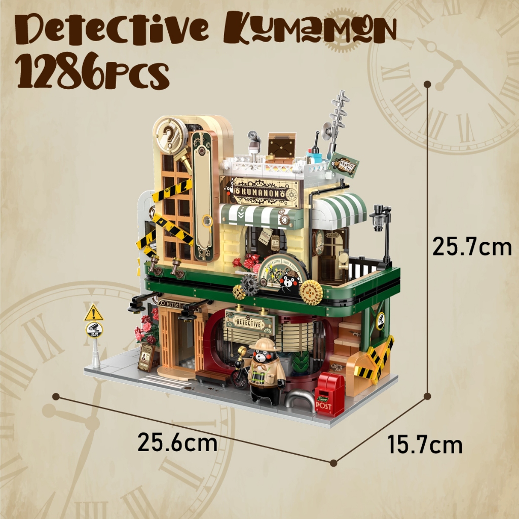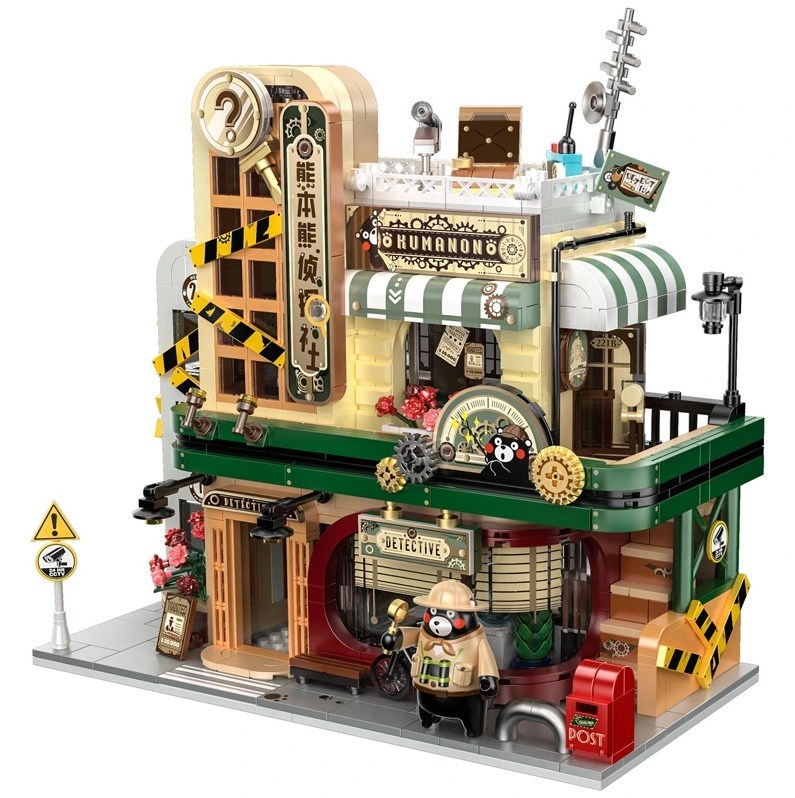 Die Panlos 880035 Kumamon™ Private Detective Society ist ein echter Hingucker, nicht zuletzt dank der gelungenen Farbauswahl. Die gelb-schwarzen Latten an der Fassade vermitteln den Eindruck eines leicht baufälligen Gebäudes. Zahlreiche Details wie Lampen, goldene Zahnräder oder das ausgefeilte Innenleben verfeinern das Design. Eine Außentreppe führt zum Balkon im Obergeschoss.