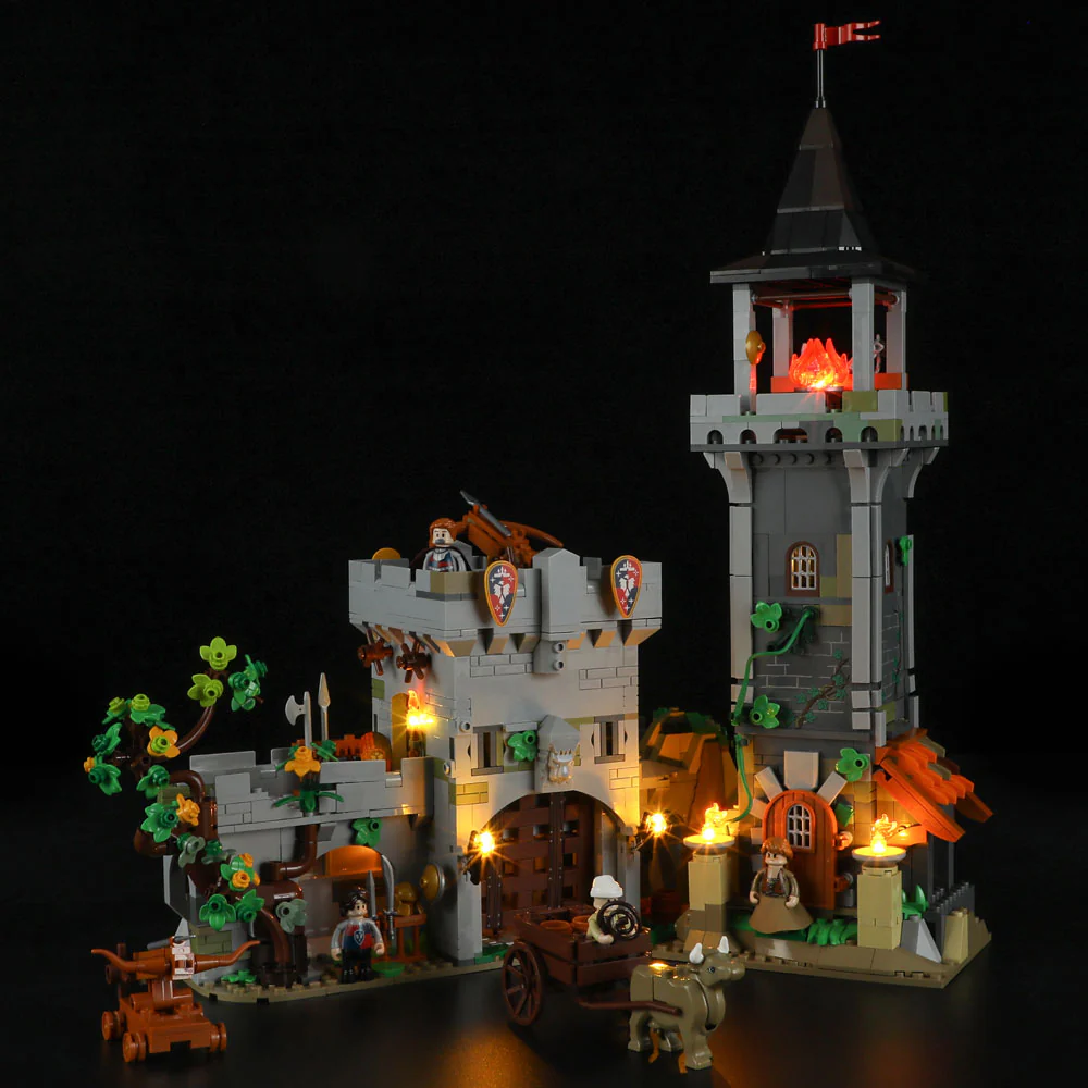 10 Lichtpunkte schaffen stimmungsvolle Akzente – von flackernden Fackeln bis zum nächtlichen Lagerfeuer auf dem Turm. Inklusive Figuren & Zubehör: 4 Minifiguren, Ochsengespann mit Wagen und eine große Armbrust bringen Leben in deine Szene