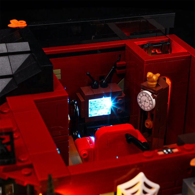 Technisch und gestalterisch setzt das Set Maßstäbe: Ganze 15 LEDs (plus vier Lichtleisten) sind bereits integriert und lassen das Spukhaus in flackerndem Licht erwachen – ein Feature, das sonst nur mit separaten Kits möglich wäre. Drei abnehmbare Etagen und eine aufklappbare Rückwand erlauben den vollen Blick ins detailverliebte Innenleben: ein geheimnisvoller Dachboden, ein Wohnzimmer mit „verfluchtem Fernseher“ und ein Arbeitszimmer mit dämonischem Buch. Beim Bauen ist Fingerspitzengefühl gefragt – insbesondere beim präzisen Verlegen der Lichtkabel – doch jeder Schritt fühlt sich an, als würdest du selbst Teil der Geistergeschichte werden. Mit über 2.600 Teilen bietet das Set ein anspruchsvolles, aber enorm befriedigendes Bauerlebnis. Liebevolle Drucke statt Sticker und kleine Extras wie eine extra Pinzette unterstreichen den Premium-Anspruch dieses Modells.
