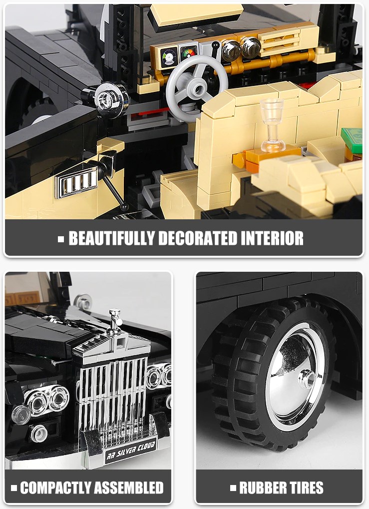 Dieser Oldtimer gehört zu einer ganzen Reihe von Automobil-Sammlerstücken für Erwachsene. Die detailgetreuen Autos sehen erstklassig aus und dürfen in keiner Vitrine fehlen. Zu den 868 Teilen des Sets gehören dutzende verchromte Noppensteine, die den Zierleisten, dem Kühlergrill oder den Radkappen einen besonderen Glanz verleihen.