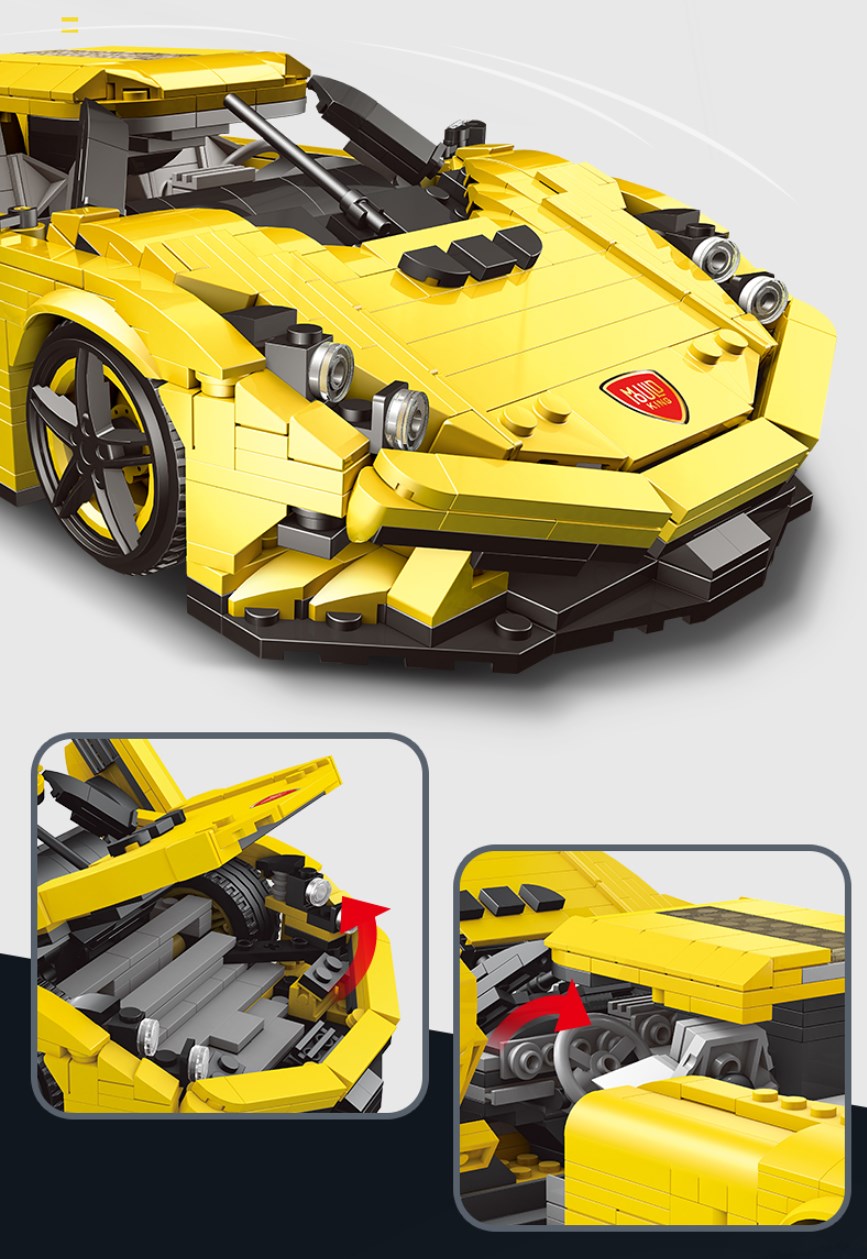 Funktionen: Türen, die Motorhaube und der Kofferraum lassen sich öffnen. Die klassische gelbe Karosserie-Farbe, sowie die stylischen Felgen und der imposante Heckspoiler (verstellbar) runden den Gesamteindruck ab. Wie immer bei Mould King sind die Steine nach Bauabschnitten in Tüten vorsortiert und die Anleitung leicht verständlich.