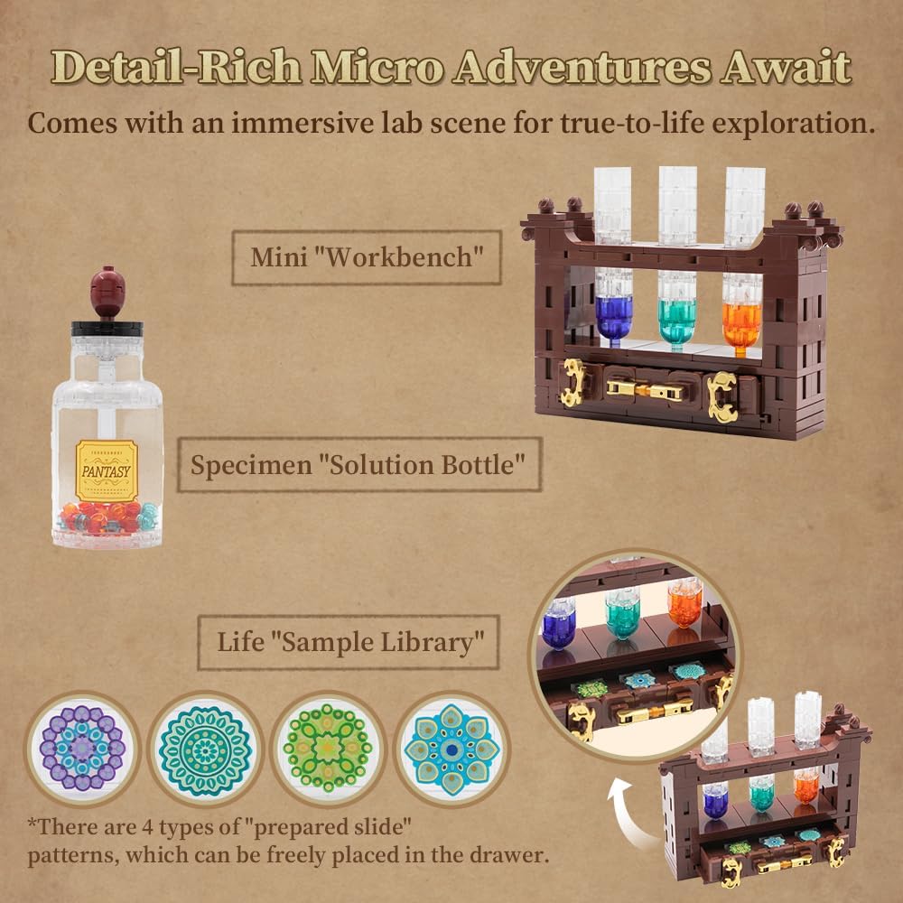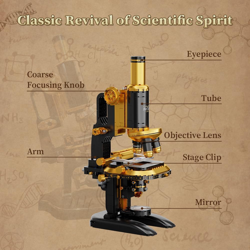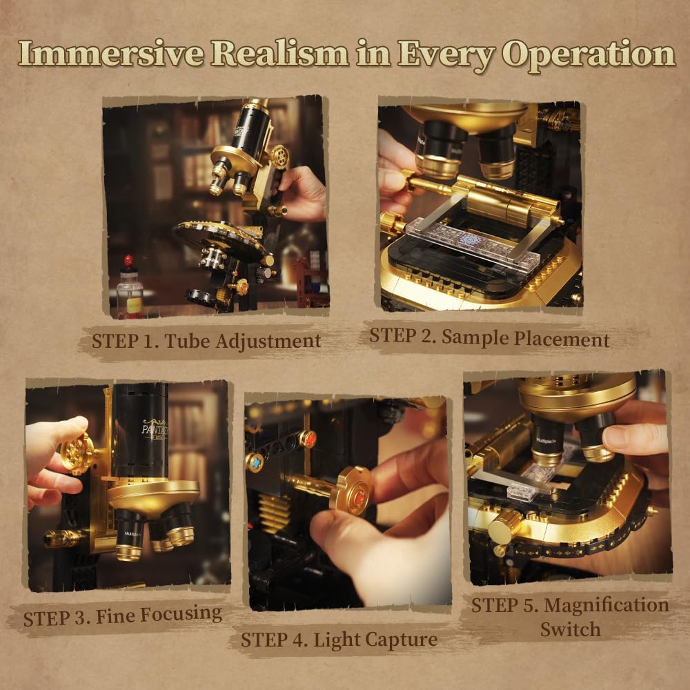 Nicht nur ein statisches Modell – der Bausatz bildet authentische Mikroskopfunktionen nach: das Neigen des Tubus, Fixieren der Präparate mit Halteklammern, Drehen des Grobfokussierknopfs, Anheben und Absenken des Spiegels zur Lichtanpassung sowie den Wechsel der Objektive. Jede Funktion bringt dich dem echten Mikroskoperlebnis beim Bauen näher.