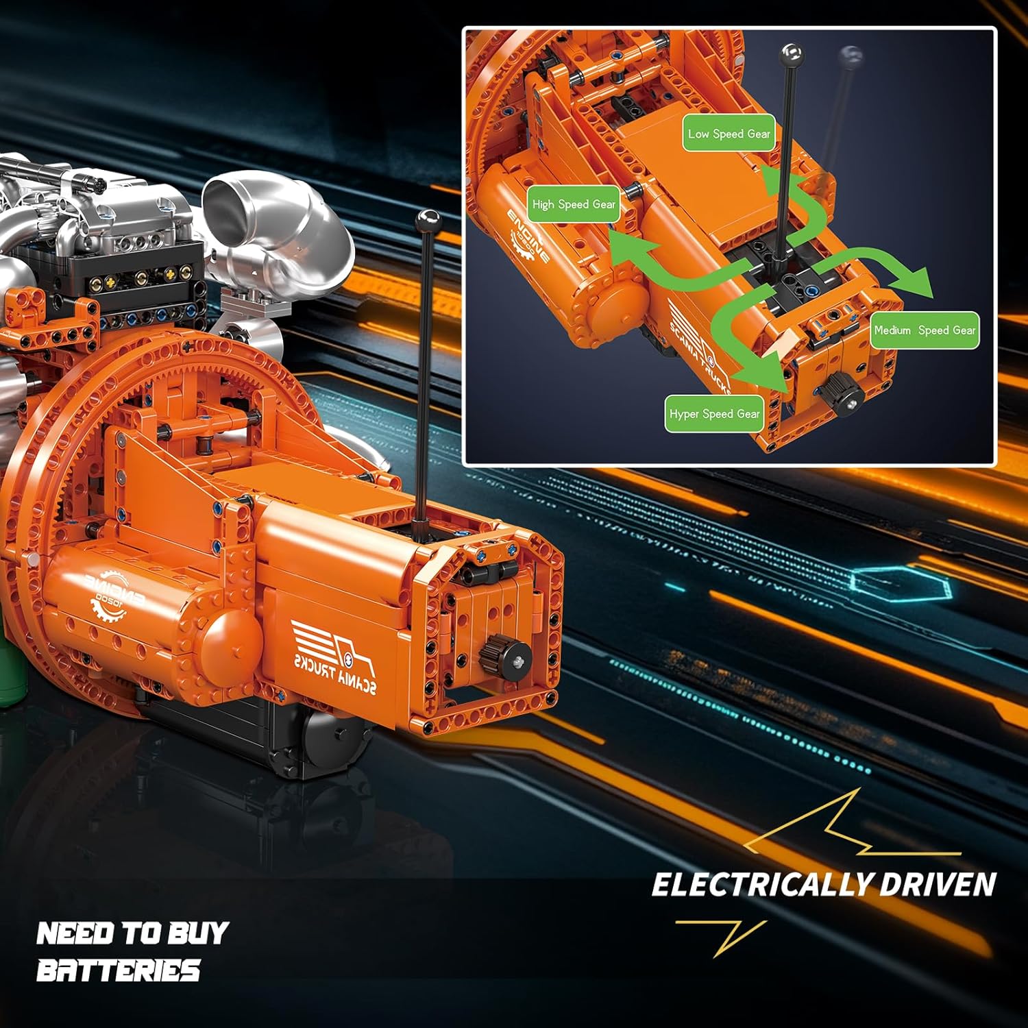 Der Scania Truck-Motor von Mould King ist ein motorgetriebenes Modell eines beeindruckenden 6-Zylinder LKW- erbrennungsmotors (samt Getriebe), das für Technik- und Automobilenthusiasten ab 14 Jahren konzipiert wurde. Dieses Set enthält einen L-Motor sowie eine Batteriebox.