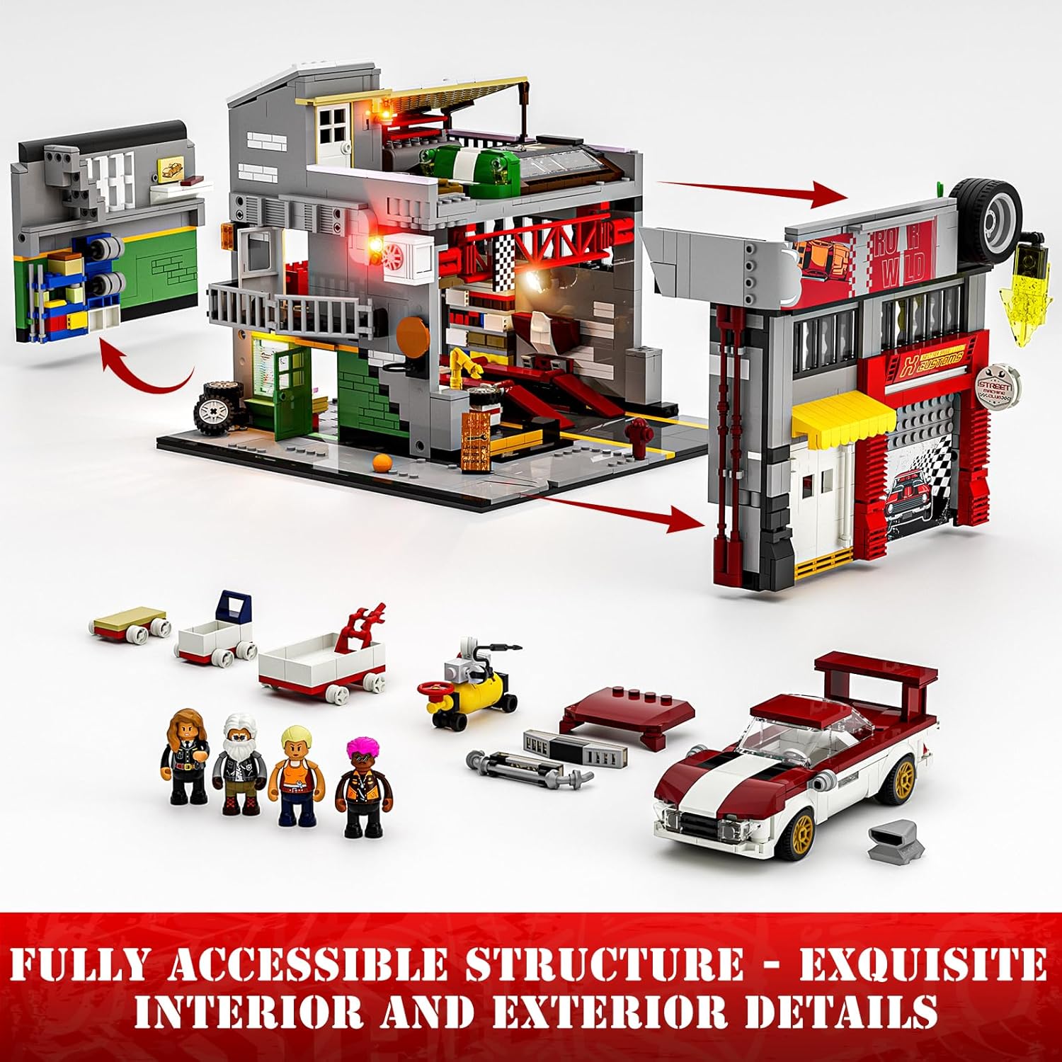 Die Bauweise steckt voller cleverer Details: Zwei verschiedene Garagentore – Klapp- und Rolltor – eröffnen flexible Möglichkeiten, während sich die gesamte Vorderfront abnehmen lässt, um den Werkstattinnenraum komplett erlebbar zu machen. Highlight sind die integrierten COB-LED-Leuchtstreifen, die den authentischen Retro-Look amerikanischer Neonlichter perfekt nachbilden und das Modell nach Einbruch der Dunkelheit lebendig wirken lassen. Mit über 1.900 Teilen und zahlreichen bedruckten Elementen wie Graffiti, Schildern und Werkzeugdetails wird jeder Bauabschnitt zum Erlebnis. Auch das mitgelieferte Sportfahrzeug samt Tuningteilen bringt zusätzlichen Bastel- und Spielspaß – eine Hommage an das Herzstück jeder Schraubergarage.