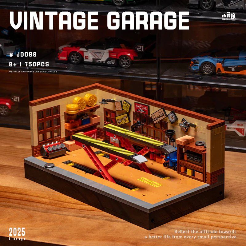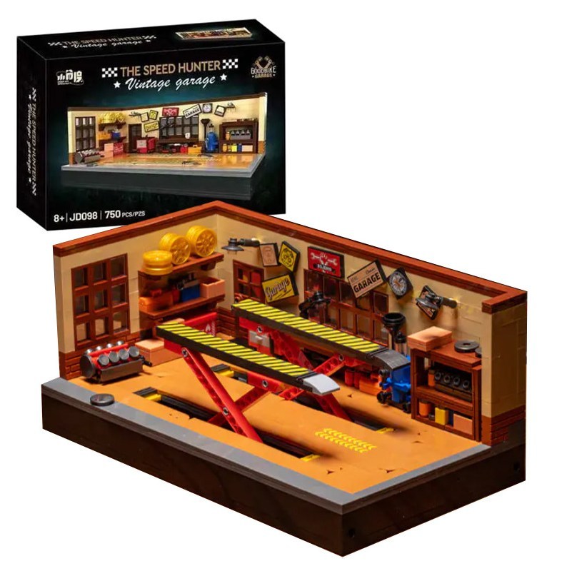 Vintage Garage (geeignet für 8 Noppen breite Fahrzeuge) mit vielen Details und beweglicher Hebebühne. Bestehend aus 750 Teilen, 15 davon bedruckt.