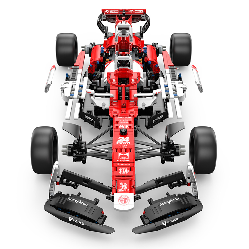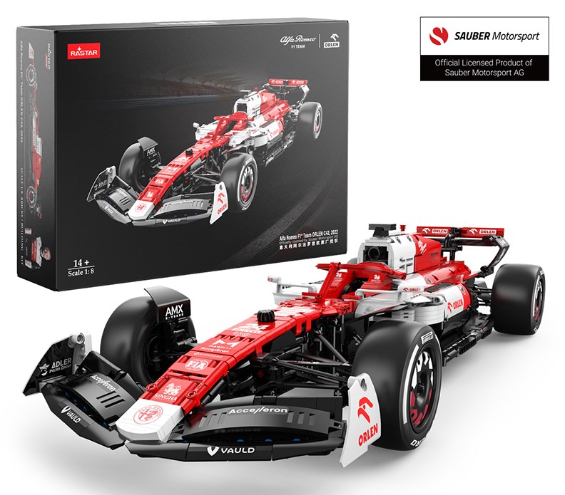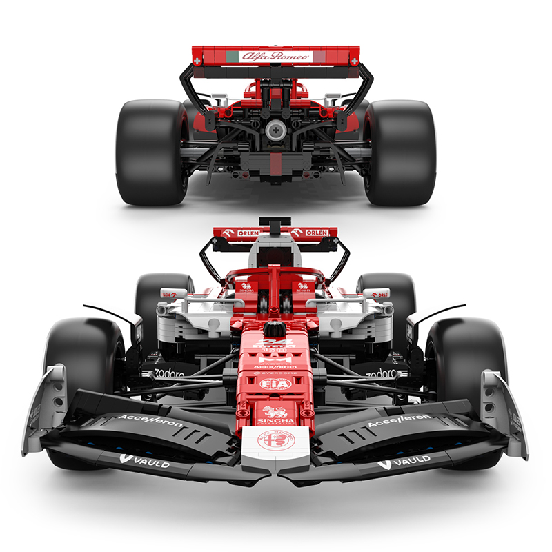 Lizenzierter Formel 1 Renner aus dem Hause Alfa Romeo mit Steinen von GoBricks. Rastar hat für dieses Modell neue Reifen und Felgen entwickelt, die vollständig bedruckt sind. Zudem sind es Slicks, welche an der Vorderachse schmaler als an der Antriebsachse ausfallen. Rastar verwendet ebenfalls ein bedruckte Steine, wie die Slopes an der Nase und die Tile 2 x 4 auf dem die Startnummer steht. Diese Fliese liegt zweimal bei, um beide Fahrer im Rennstall aufzuzeigen. Die Werbeapplikationen sind als Sticker ausgeführt.