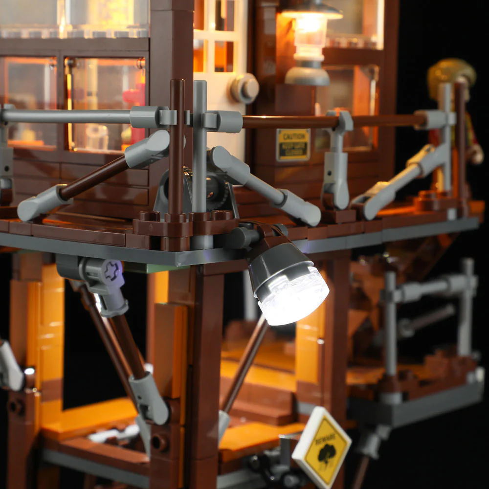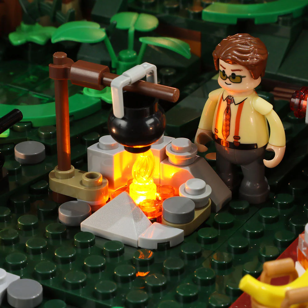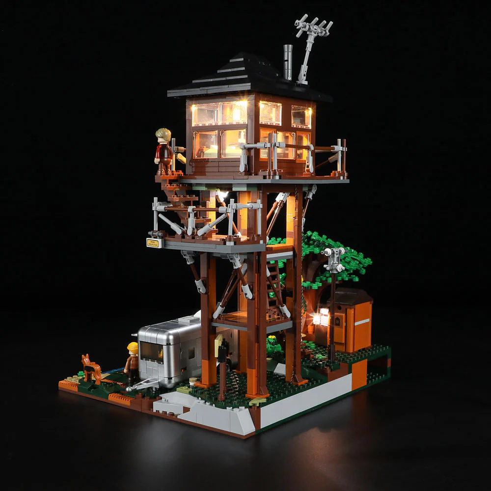 Was dich erwartet: Vierstöckiger Aussichtsturm mit gemütlichem Schlafzimmer im obersten Stock und drei Zugängen über Außentreppen.Ein offener Lagerplatz mit silbernem Wohnmobil, Picknickdecken, Lagerfeuer, Fluss mit Angelstelle und einem versteckten Außentoilettenhäuschen hinter einem Baum. 3 Minifiguren, ein Schäferhund und ein Vogel – ideal für eigene Camping-Geschichten, sowie 8 Lichtpunkte: darunter flackerndes Feuer, Windlichter und warme Innenbeleuchtung - für stimmungsvolle Lagerfeuerabende.
