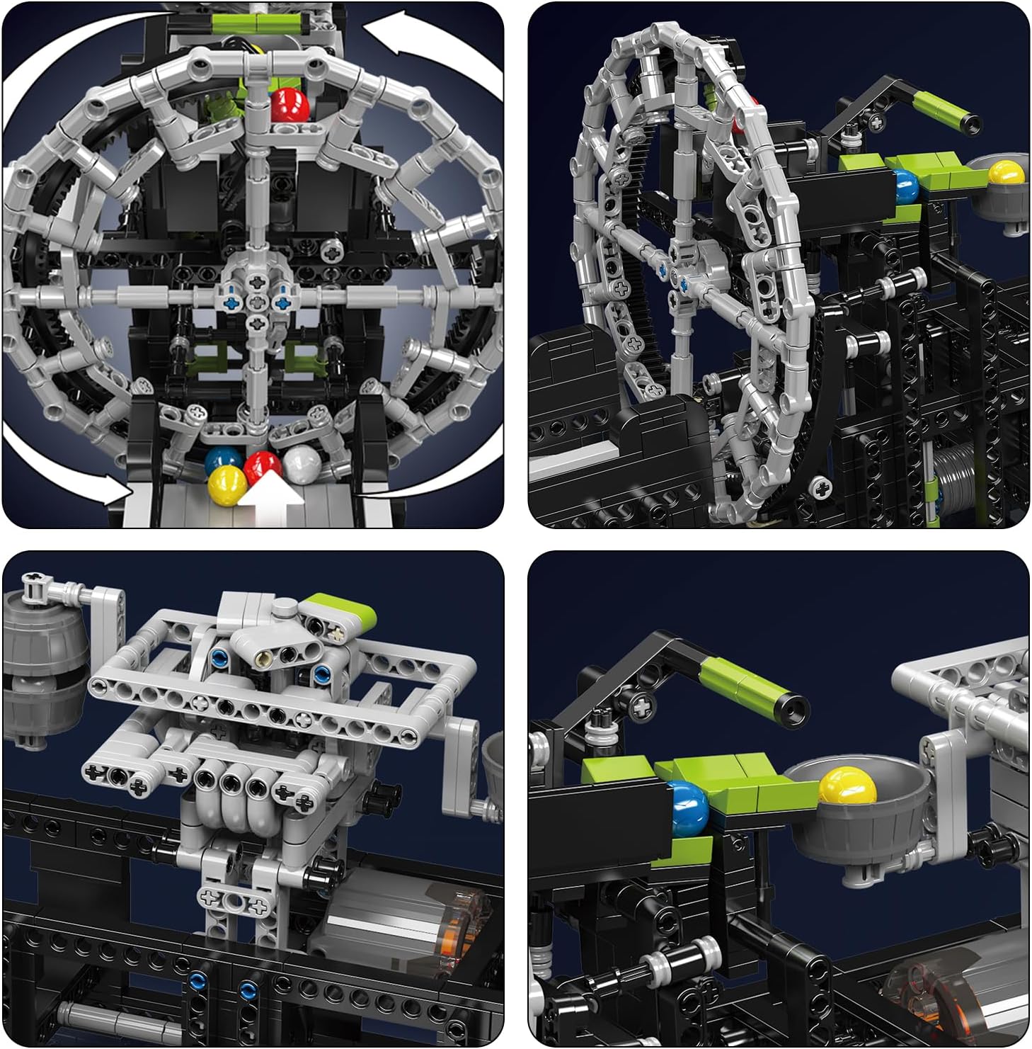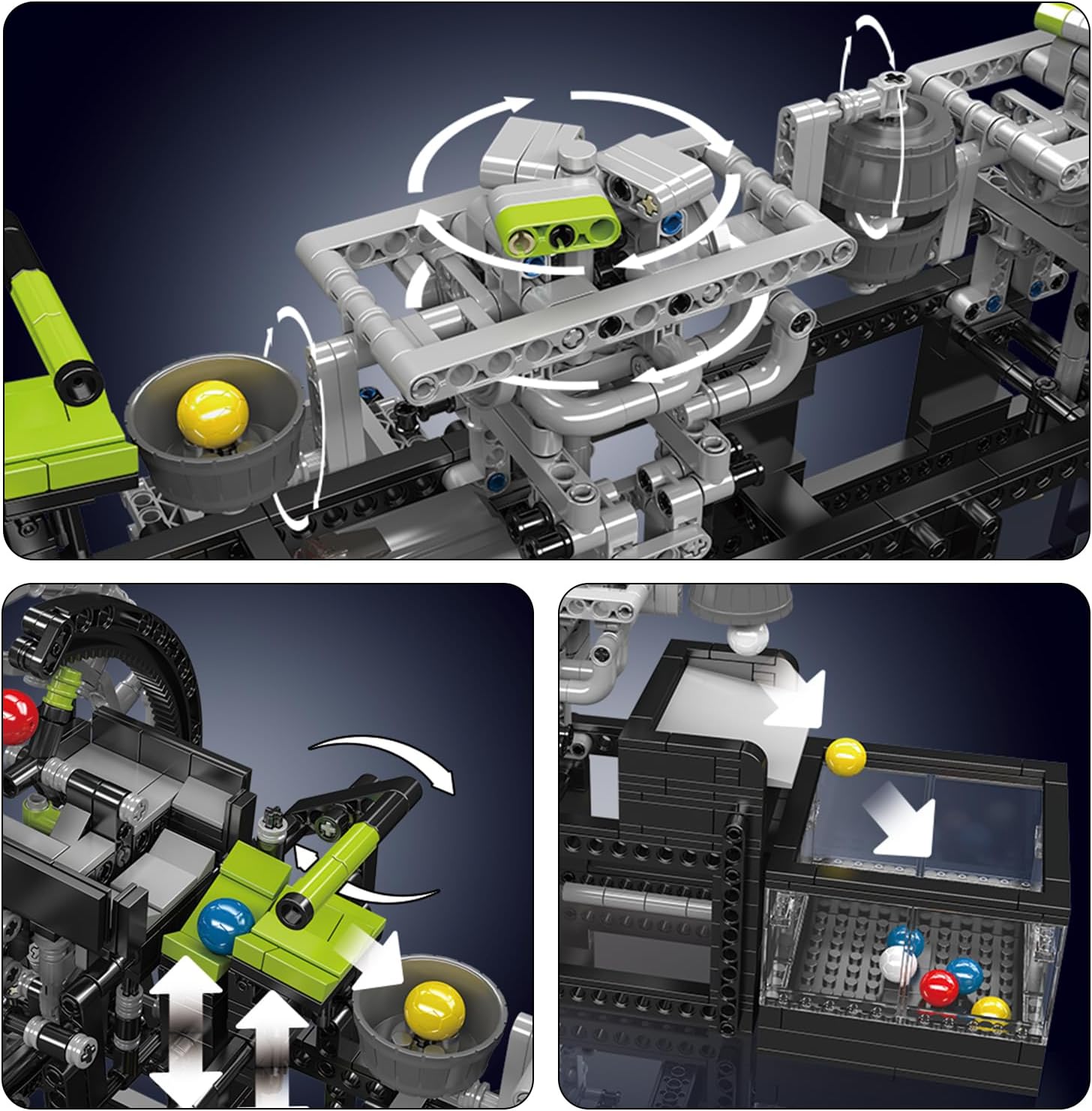 Das voll-motorisierte Set wird über einen XL-Motor angetrieben, dessen Funktion es ist Kugeln über einen Hebemechanismus nach oben zu befördern und diese Schritt für Schritt in einen Auffangkorb weiter zu reichen.