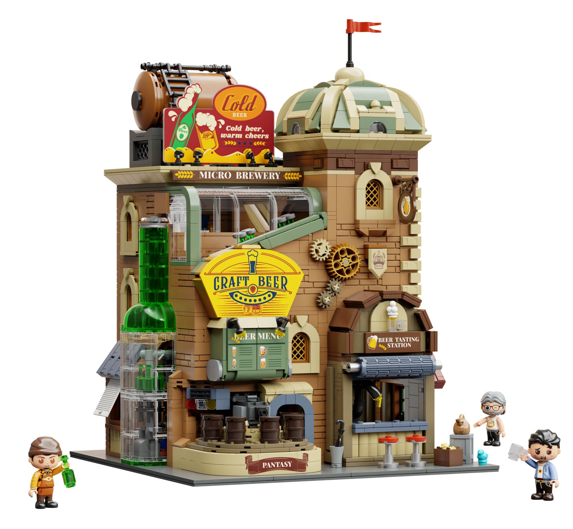 Herzlich willkommen in deiner eigenen kleinen Brauerei! Dieses detailverliebte Klemmbaustein-Set lässt dich in die Welt des Bierbrauens eintauchen. Schon von außen versprüht die Craft-Brauerei nostalgischen Charme: Zahnräder und Rohre zieren die Backsteinfassade, ein großes Schild mit der Aufschrift "Craft Beer" lädt durstige Gäste ein und auf dem Dach thront ein alter Wassertank neben einer kupferfarbenen Braukessel-Kuppel. Man fühlt sich direkt wie vor einer echten Brauerei in einer malerischen Altstadt – nur eben im Miniaturformat.