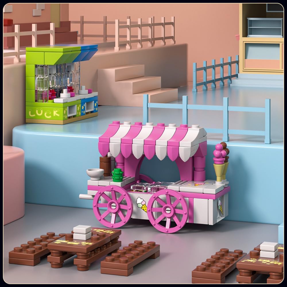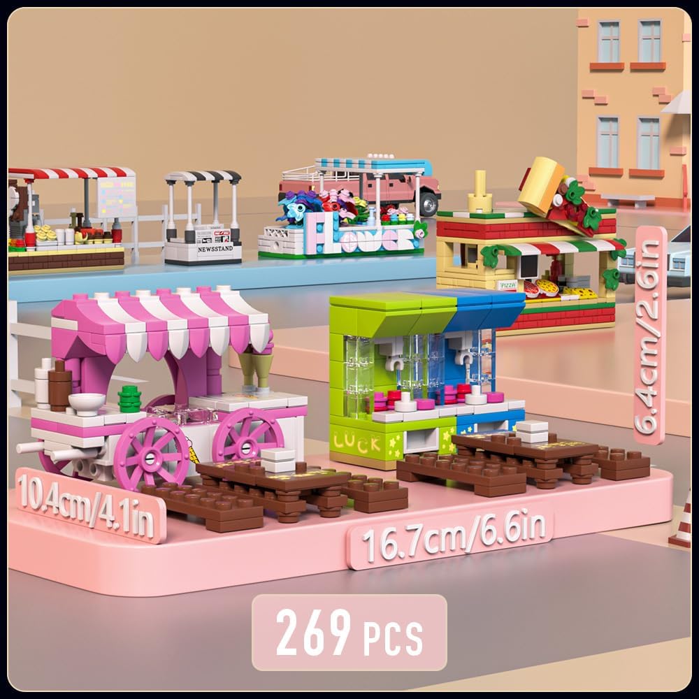 Erschaffe Deinen eigenen kleinen Markt mit vielen verschiedenen Geschäften und Minifiguren.