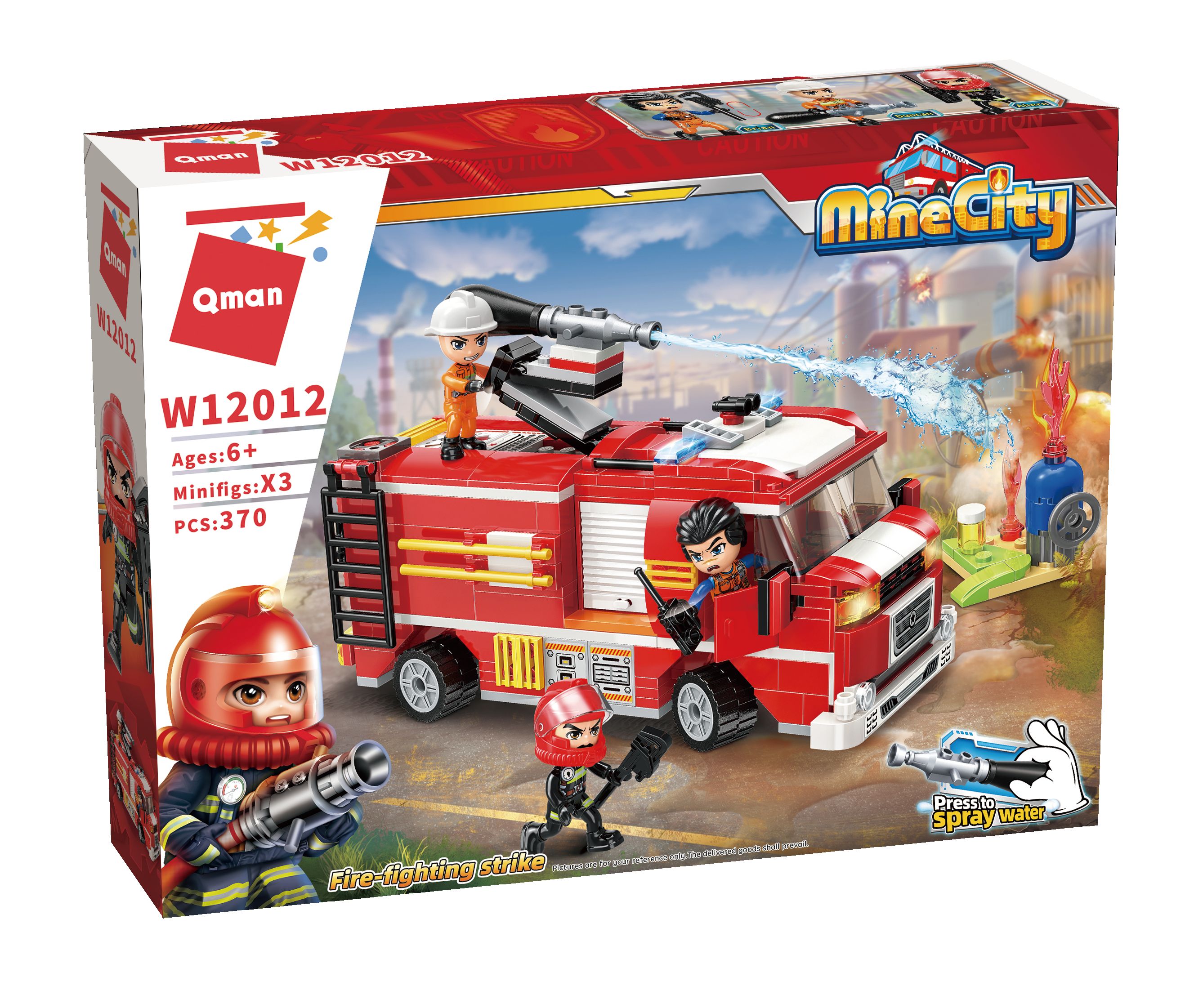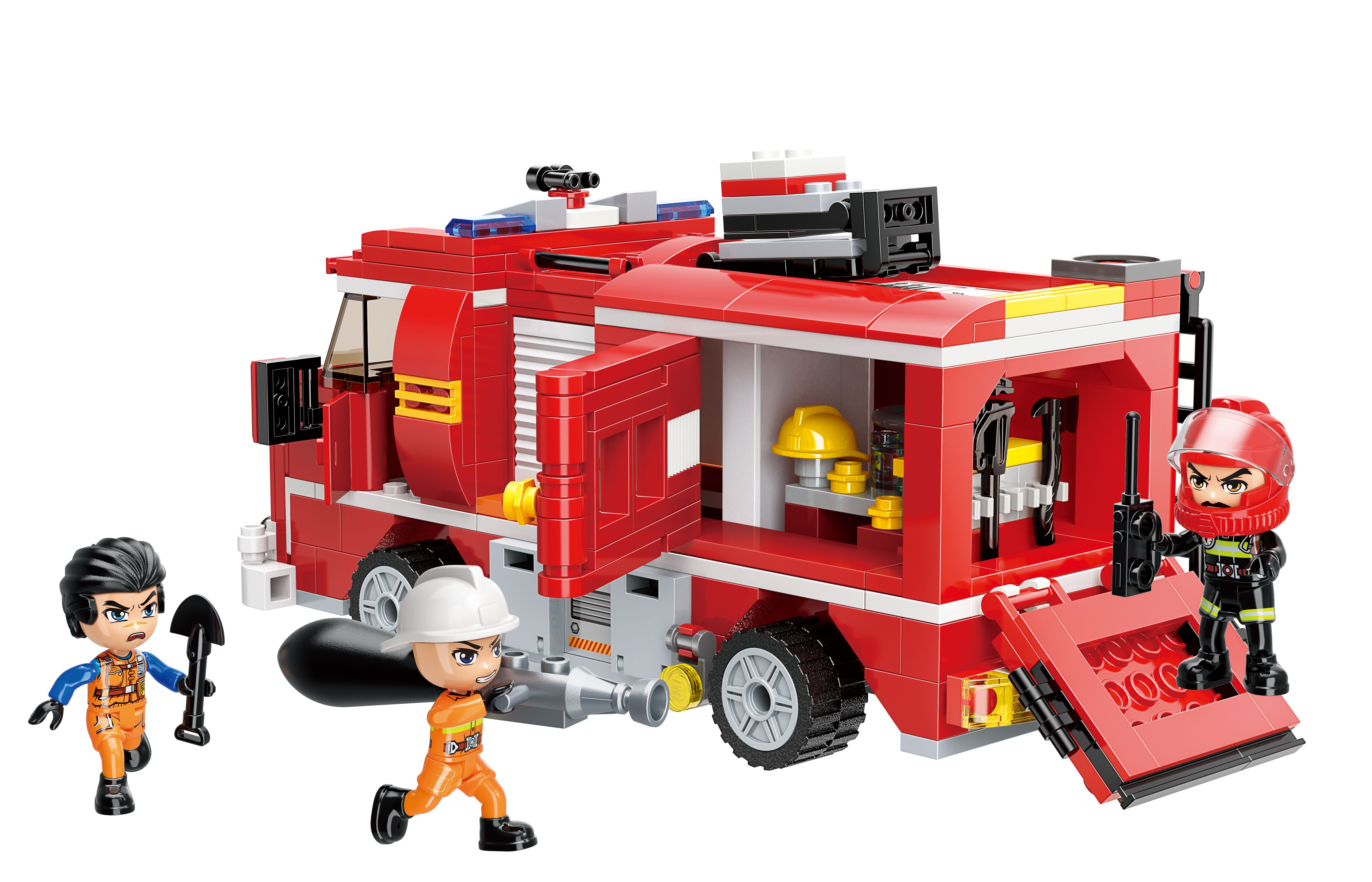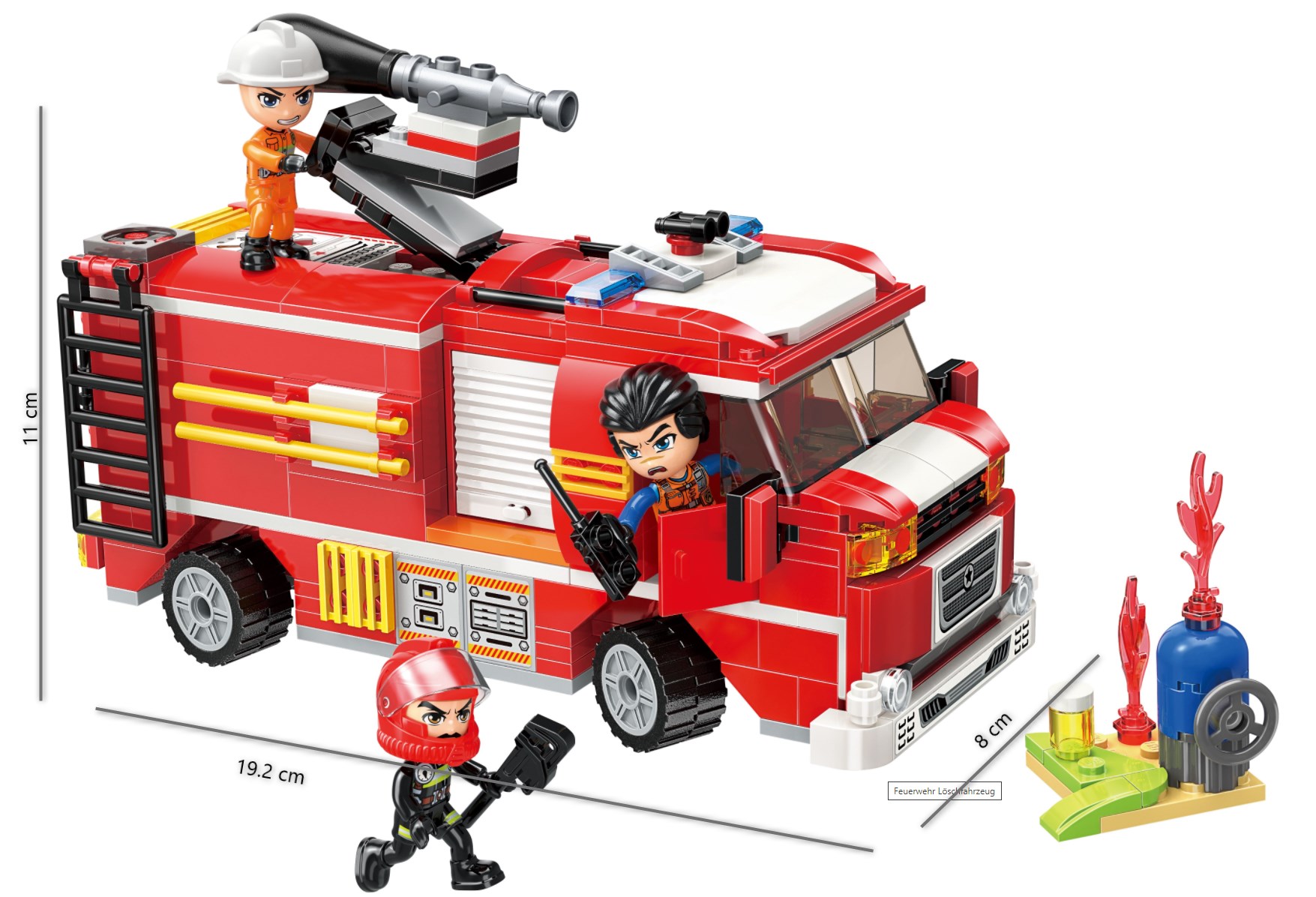 Tolles Feuerwehr Löschfahrzeug, mit dem der brennende Gastank schnell unter Kontrolle ist. Falls der Brand doch mal zu gross ist, eilen die Kameraden aus der grossen Feuerwehrstation zu Hilfe. Die Wasserkanone kann Wasser bis zu 50cm weit spritzen.