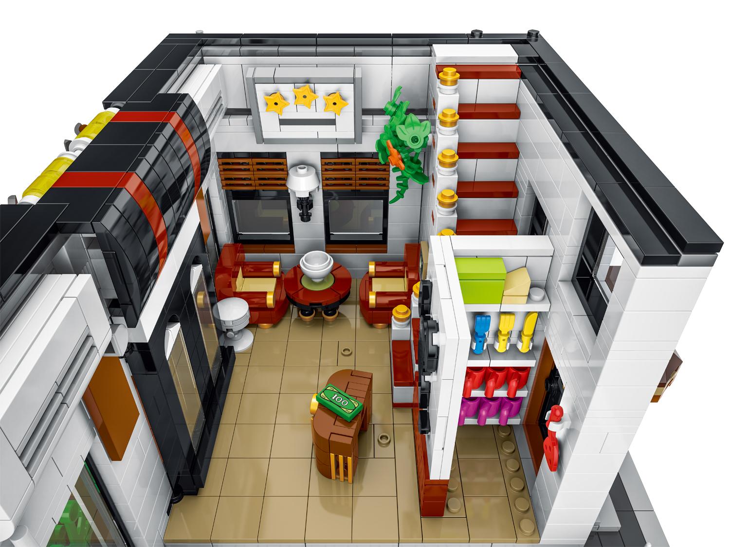 The Office aus der Feder des bekannten MOC-Designer ohsojang ist erfrischender weise mal weder Einzelhandel noch Gastronomie, sondern ein Bürogebäude. Allein dafür kann sich der Kauf schon lohnen. Darüber hinaus bietet es ein schickes, modernen Designs, dazu eine witzige Modularität und großartige Funktionen. Keine Aufkleber, 50 bedruckte Teile PanBo ist ein neuer Markenname, aber inhaltlich identisch zu Mork. Neue Version mit Steinen der Marke GoBricks.