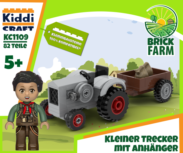 Kiddicraft KC1110 Großer Schlepper mit Anhänger Der große Traktor mit seinem praktischen Anhänger hilft bei Ernte, Stroh- und Heutransporten. Er passt ohne Anhänger in die Deele des Bauernhof-Stalls KC1108. Das Set enthält: 211 Teile und 2 KIDDIZ Figuren