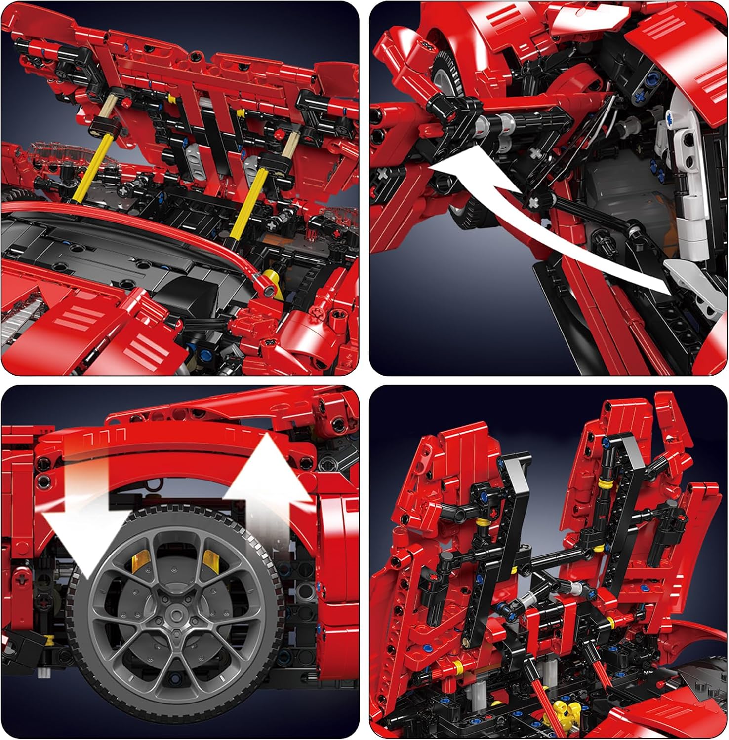 Besondere Merkmale: Die Motorhaube, die Heckabdeckung und die Türen des Sportwagens können geöffnet werden. Elektrisch anhebbares Fahrgestell: Das Fahrgestell des Autos kann elektrisch angehoben und abgesenkt werden, was das Modell noch realistischer macht.