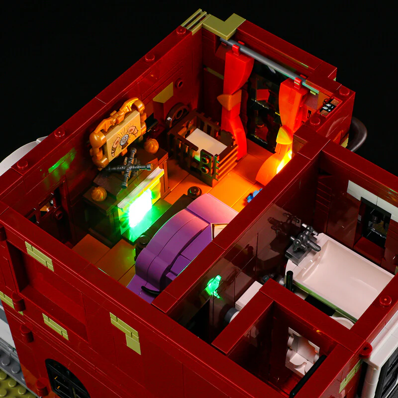 Technisch und gestalterisch setzt das Set Maßstäbe: Ganze 15 LEDs (plus vier Lichtleisten) sind bereits integriert und lassen das Spukhaus in flackerndem Licht erwachen – ein Feature, das sonst nur mit separaten Kits möglich wäre. Drei abnehmbare Etagen und eine aufklappbare Rückwand erlauben den vollen Blick ins detailverliebte Innenleben: ein geheimnisvoller Dachboden, ein Wohnzimmer mit „verfluchtem Fernseher“ und ein Arbeitszimmer mit dämonischem Buch. Beim Bauen ist Fingerspitzengefühl gefragt – insbesondere beim präzisen Verlegen der Lichtkabel – doch jeder Schritt fühlt sich an, als würdest du selbst Teil der Geistergeschichte werden. Mit über 2.600 Teilen bietet das Set ein anspruchsvolles, aber enorm befriedigendes Bauerlebnis. Liebevolle Drucke statt Sticker und kleine Extras wie eine extra Pinzette unterstreichen den Premium-Anspruch dieses Modells.