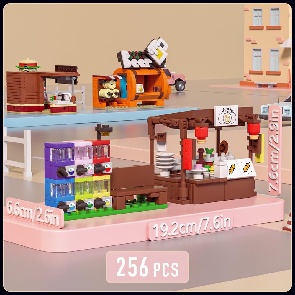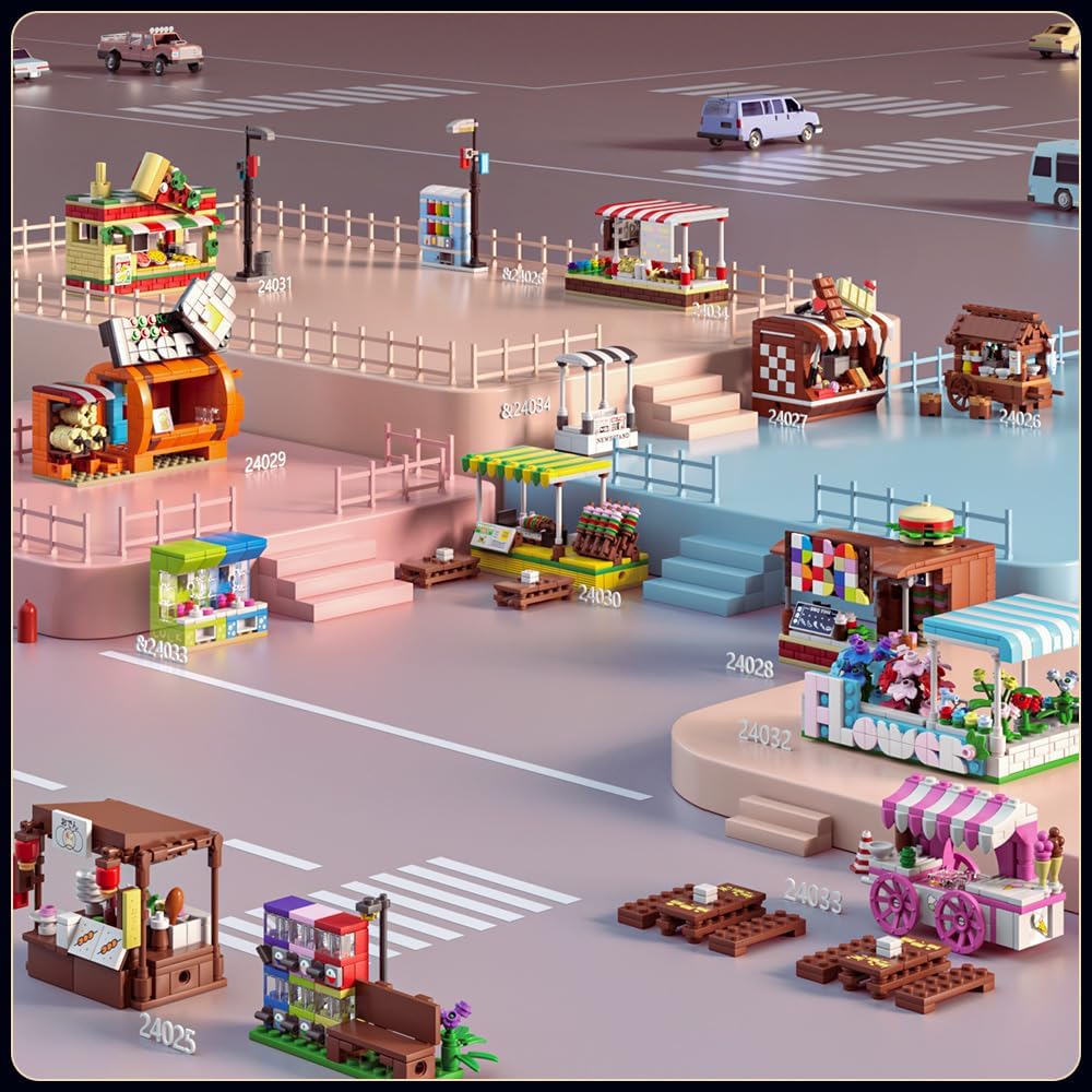 Erschaffe Deinen eigenen kleinen Markt mit vielen verschiedenen Geschäften und Minifiguren.