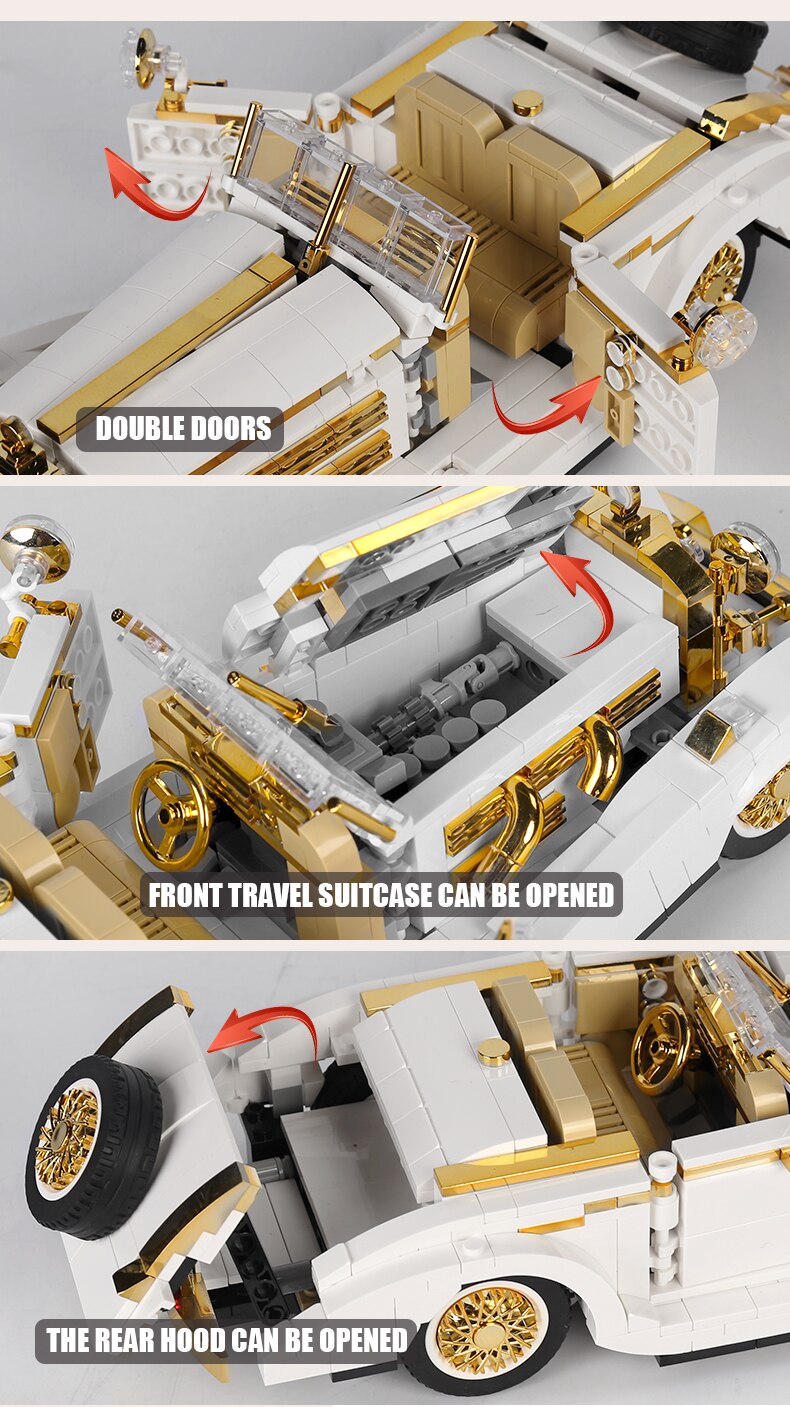 Dieser Oldtimer, angelehnt an das Design des Rolls-Royce Silver Cloud gehört zu einer ganzen Reihe von Automobil-Sammlerstücken für Erwachsene. Die detailgetreuen Autos sehen erstklassig aus und dürfen in keiner Vitrine fehlen. Zu den 1.096 Teilen des Sets gehören dutzende verchromte Noppensteine, die den Zierleisten, dem Kühlergrill oder den Radkappen einen besonderen Glanz verleihen.Türen, die Motorhaube und der Kofferraum lassen sich öffnen, aber Technikfunktionen erwartet man bei einem Displaymodell eigentlich nicht ... dennoch ist hier eine Hand-of-God-Lenkung verbaut.