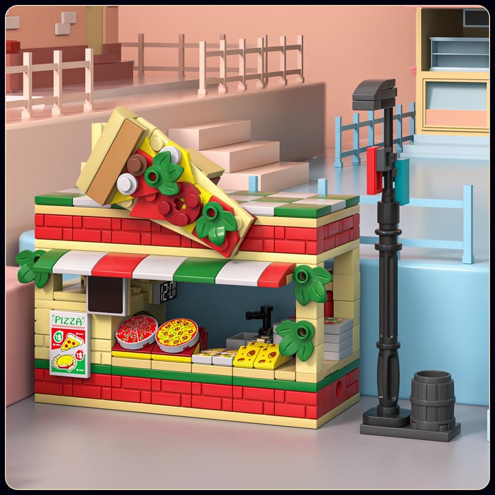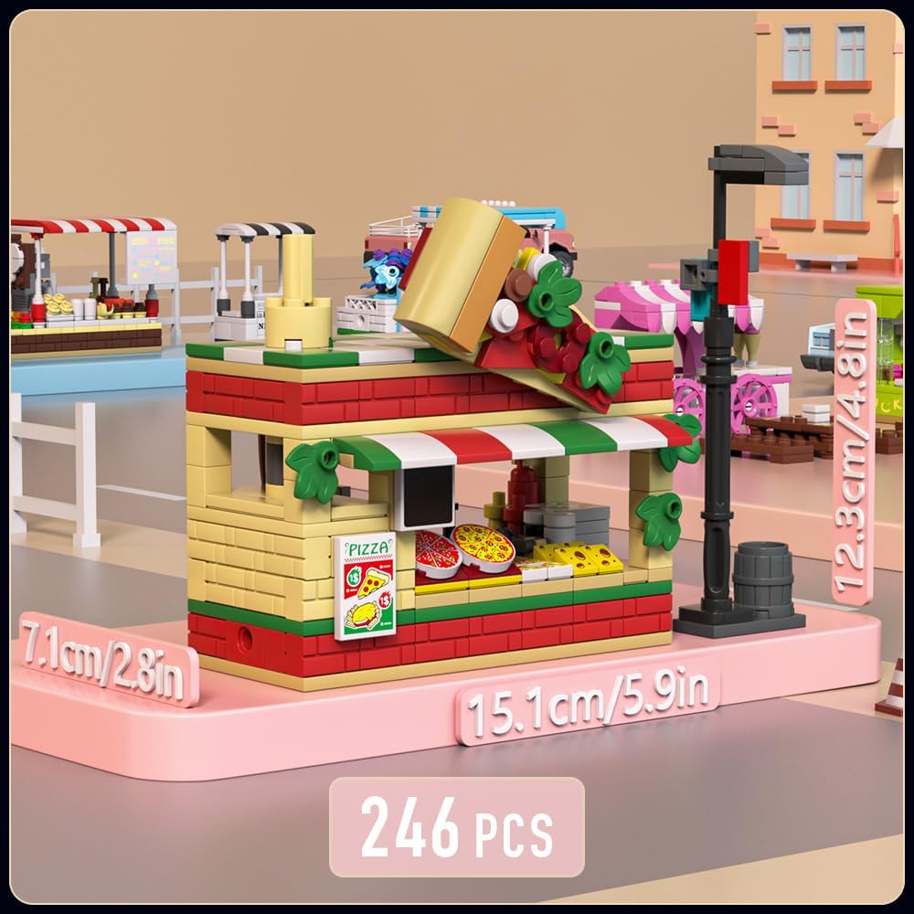 Erschaffe Deinen eigenen kleinen Markt mit vielen verschiedenen Geschäften und Minifiguren.