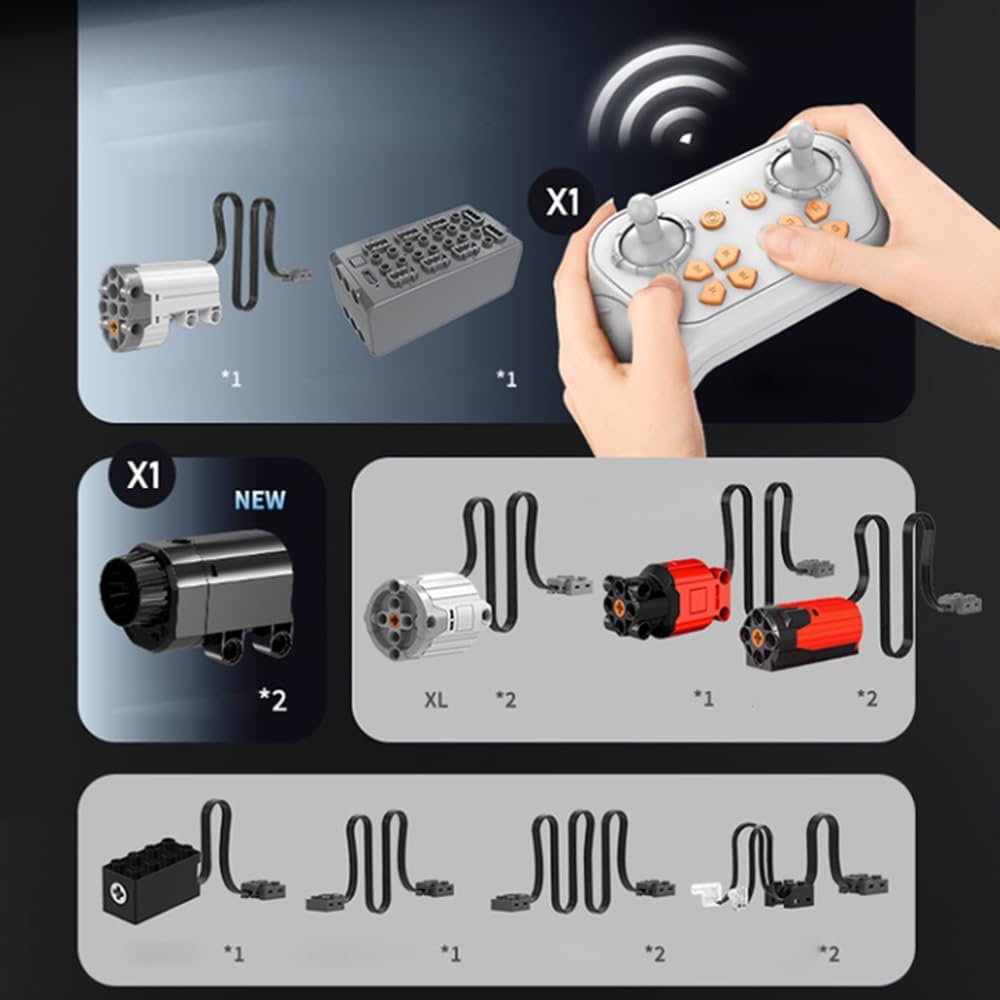 ACHTUNG: Motorisierung ist für das Set ungeeignet. Die beiden Black Furious Motoren haben zu wenig Drehmoment. Daher verkaufen wir das Set als Teilespender! Set enthält einen Servo- und zwei Black Furious L-Motoren, Akku-Box und Fernbedienung. Wie immer bei Mould King sind die Steine nach Bauabschnitten in Tüten vorsortiert und die Anleitung leicht verständlich.