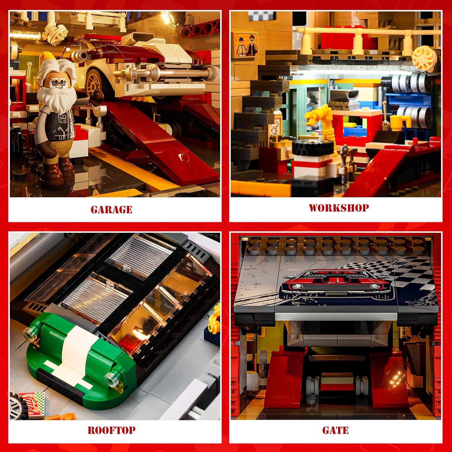 Die Bauweise steckt voller cleverer Details: Zwei verschiedene Garagentore – Klapp- und Rolltor – eröffnen flexible Möglichkeiten, während sich die gesamte Vorderfront abnehmen lässt, um den Werkstattinnenraum komplett erlebbar zu machen. Highlight sind die integrierten COB-LED-Leuchtstreifen, die den authentischen Retro-Look amerikanischer Neonlichter perfekt nachbilden und das Modell nach Einbruch der Dunkelheit lebendig wirken lassen. Mit über 1.900 Teilen und zahlreichen bedruckten Elementen wie Graffiti, Schildern und Werkzeugdetails wird jeder Bauabschnitt zum Erlebnis. Auch das mitgelieferte Sportfahrzeug samt Tuningteilen bringt zusätzlichen Bastel- und Spielspaß – eine Hommage an das Herzstück jeder Schraubergarage.