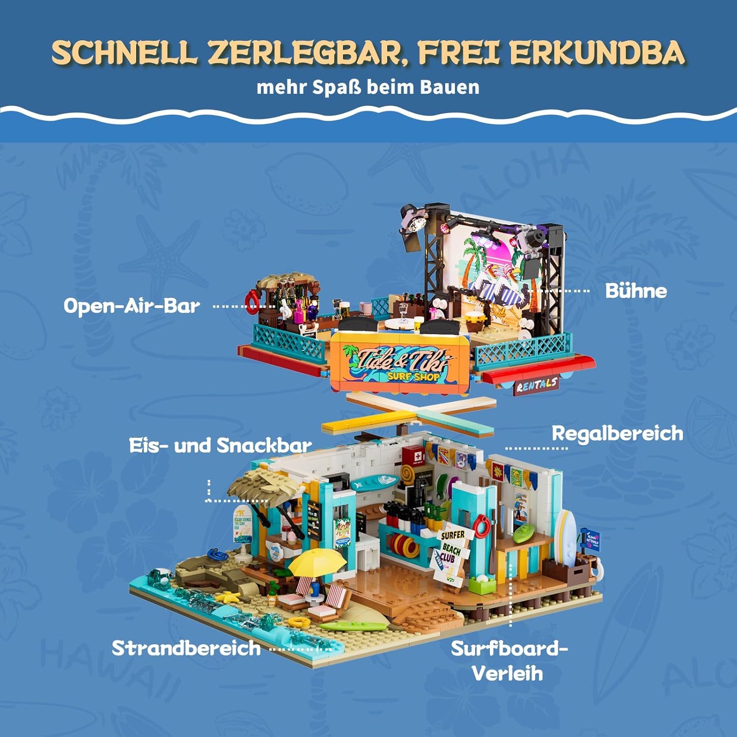 Surfbrett-Zone, Getränkebar, Lounge, Open-Air-Bar und Bühne sind hier clever und übersichtlich miteinander verbunden. Alles hat seinen Platz, wirkt aber trotzdem offen und lebendig – genau wie ein echter Beach-Spot, an dem ständig etwas passiert. Die offenen Wege sorgen dafür, dass sich deine Figuren frei bewegen können und du richtig schön Szenen nachspielen kannst: vom Surfkurs am Morgen über entspannte Bar-Momente bis hin zu kleinen Musikauftritten am Abend.