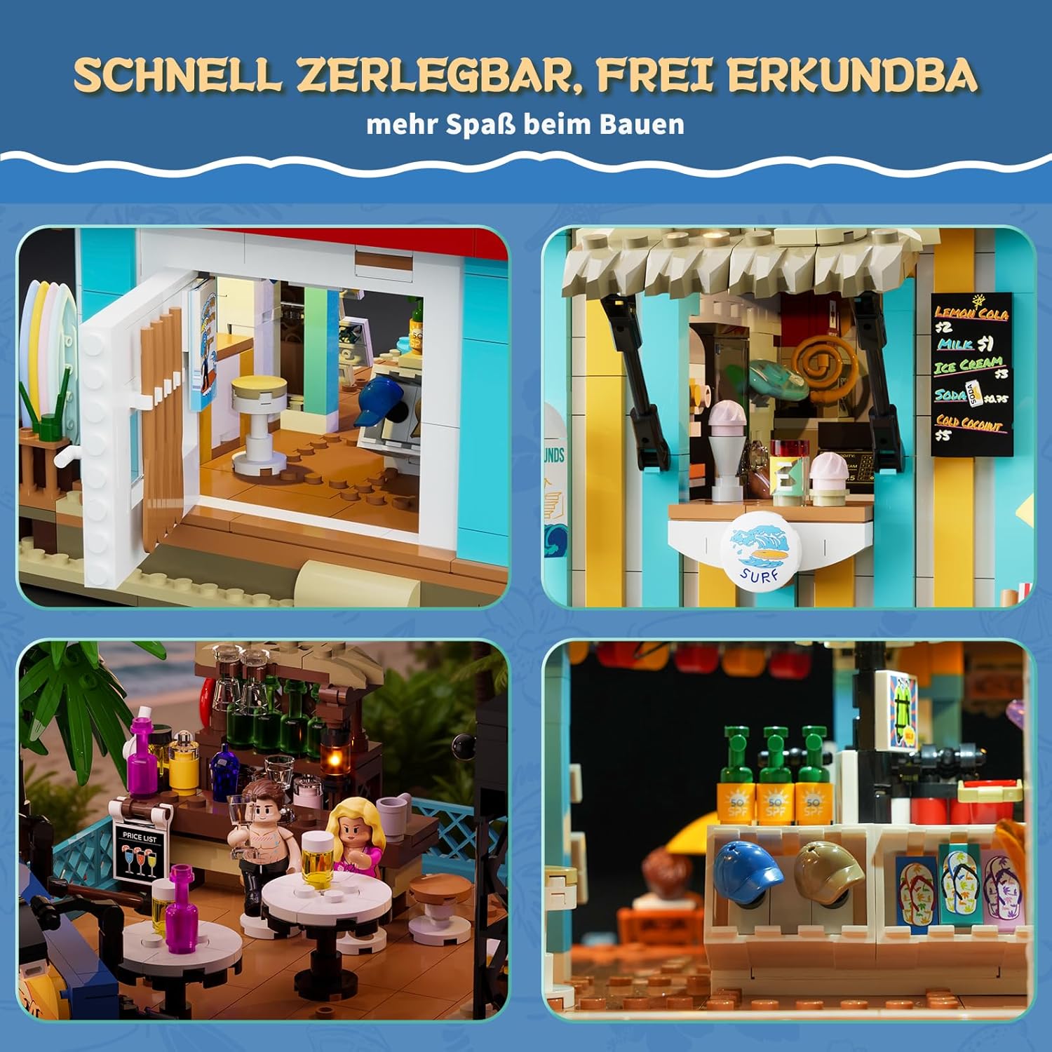 Inspiriert von einem tropischen Surfshop direkt am Meer. Helle Farben, Palmen und dieses leichte „Alles ist gut“-Gefühl sorgen sofort für echtes Küsten- und Urlaubsflair – fast so, als würdest du barfuß über warmen Sand laufen. Liebevolle Details wie ein Kreidetafel-Menü, Getränkedosen und Sonnenschirme machen die Szene richtig lebendig und geben dem Ganzen eine entspannte, realistische Atmosphäre. Kurz gesagt: ein kleines Stück Strandurlaub zum Bauen, Anschauen und einfach Abschalten