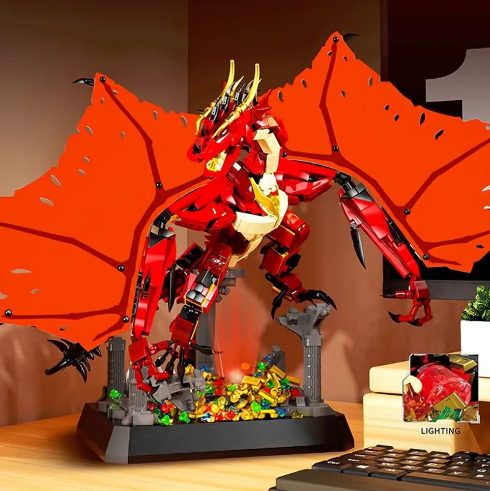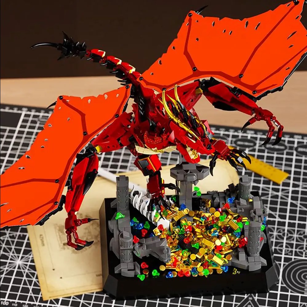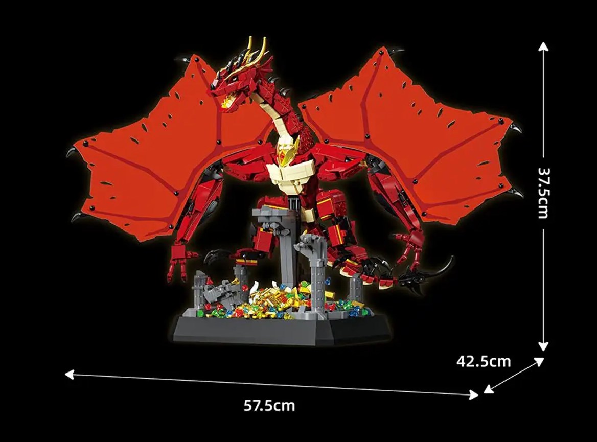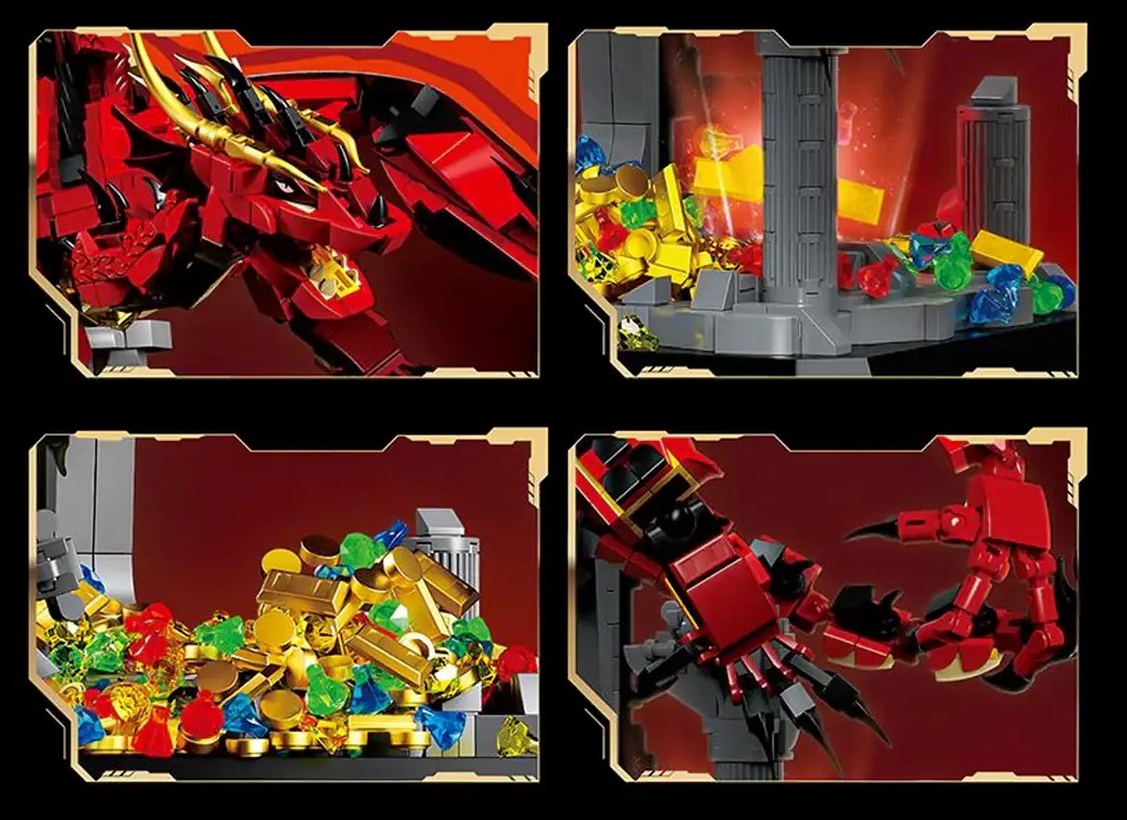 Zusätzlich sind fast 200 goldfarbene Teile und transparente Diamant-Steine enthalten, um einen atemberaubenden Schatzhort zu schaffen, der um die Basis verstreut ist und die Ästhetik der Drachenhöhle perfekt einfängt. Insbesondere wenn er von dem versteckten roten Lichtstein beleuchtet wird.