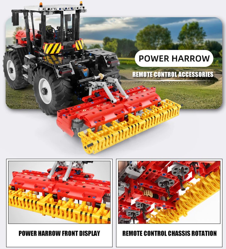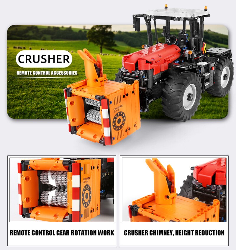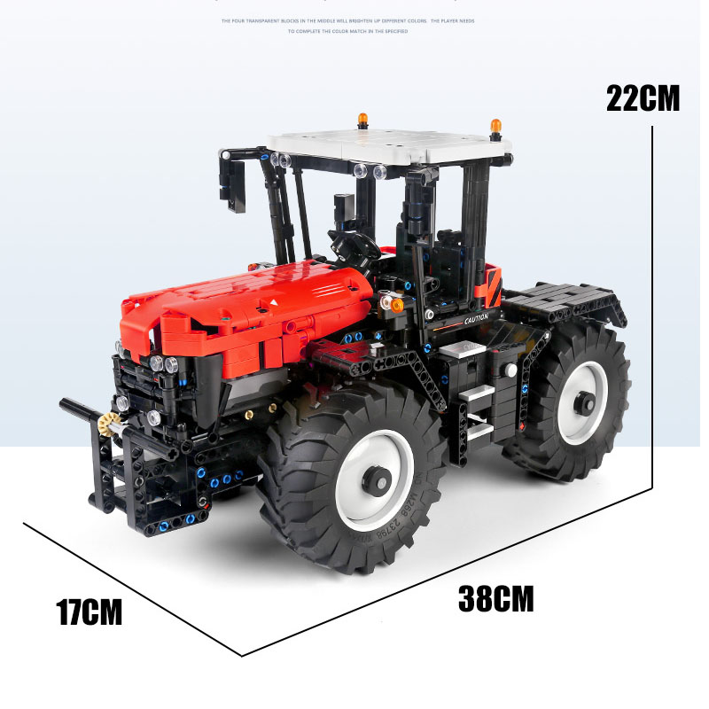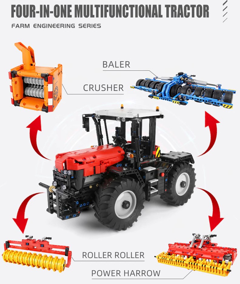 Verpackung defekt, Inhalt OK.Dieser motorbetrieben Traktor mit Motoren und vielen Anbauteilen ist mit sehr viel Liebe gestaltet worden. Bauspass garantiert! Mit Erdverdichter, Häcksler, Walzenrole und Kreiselegge. Im Unterschied zum gelbenTraktor ist er rot ;) - verfügt aber auch über andere Zubehörteile.Motoren: 1x Servo Motor, 1x M Motor, 2x M Motor, 1x Akkubox, 1x Fernsteuerung (Fernsteuerung auch über App möglich).