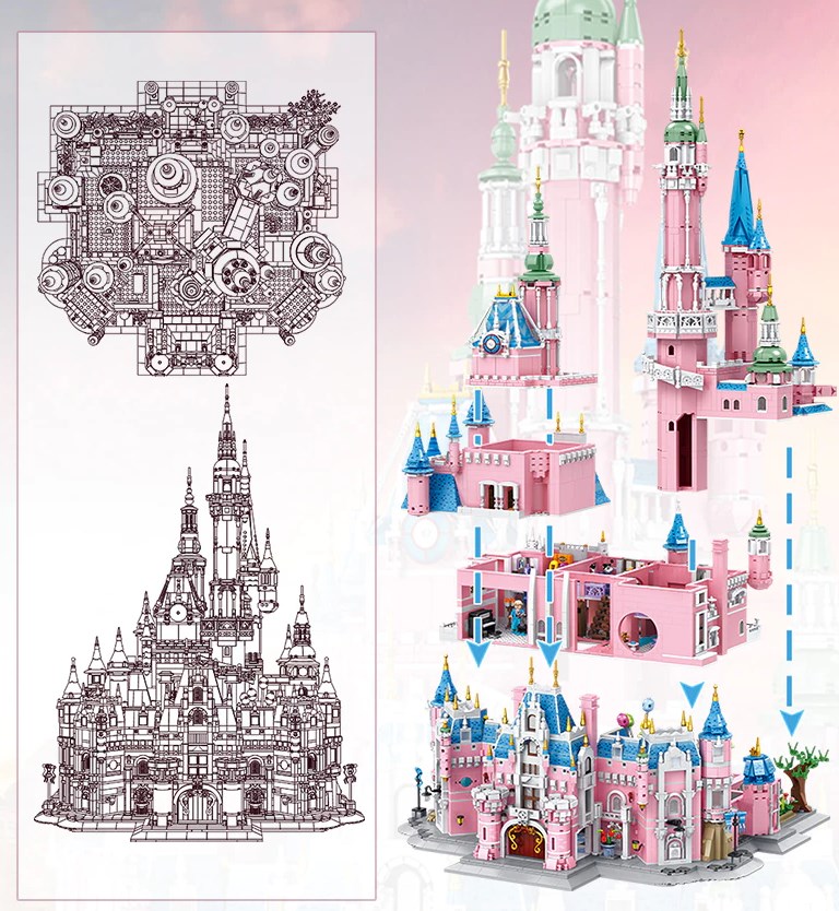 Das Dream Castle ist nicht ohne Grund eines der beliebtesten modularen Gebäude von Panlos. 10068 Klemmbausteine in gewohnt hochwertiger Panlos Qualität (viele Prints, keine Sticker) formen das riesige pinke Traumschloss. Die verschiedenen Etagen lassen sich einzeln entnehmen und sind mit zahlreiche Details gespickt.