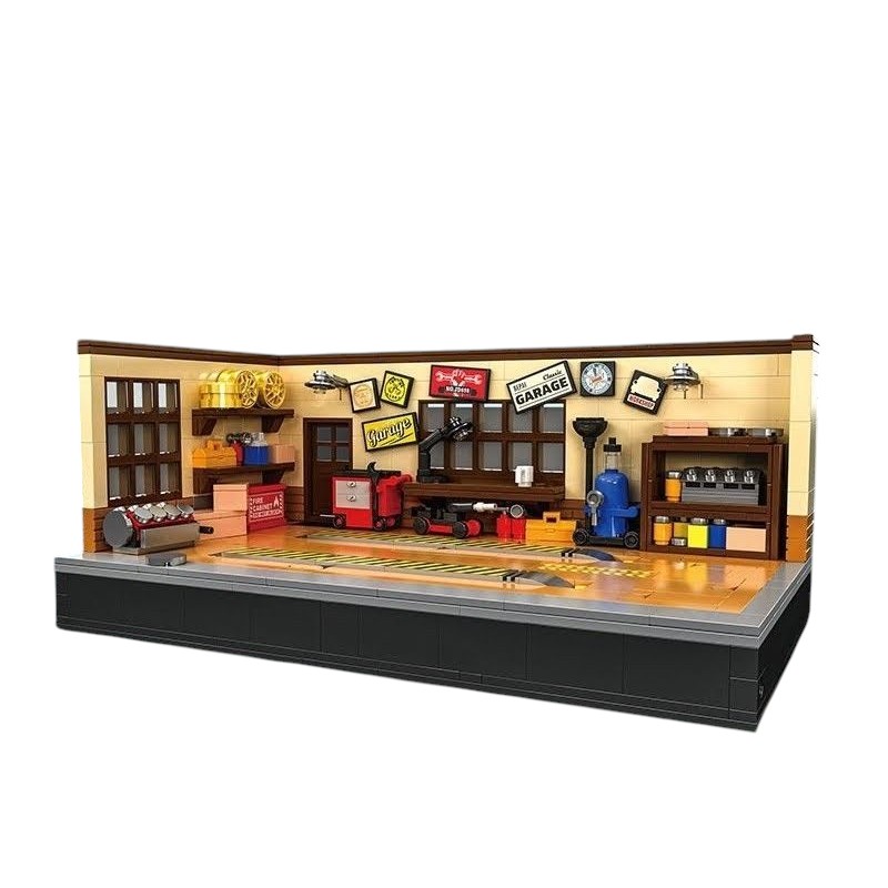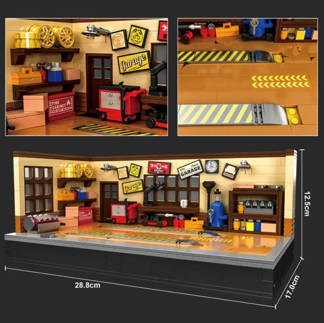 Vintage Garage (geeignet für 8 Noppen breite Fahrzeuge) mit vielen Details und beweglicher Hebebühne. Bestehend aus 750 Teilen, 15 davon bedruckt.